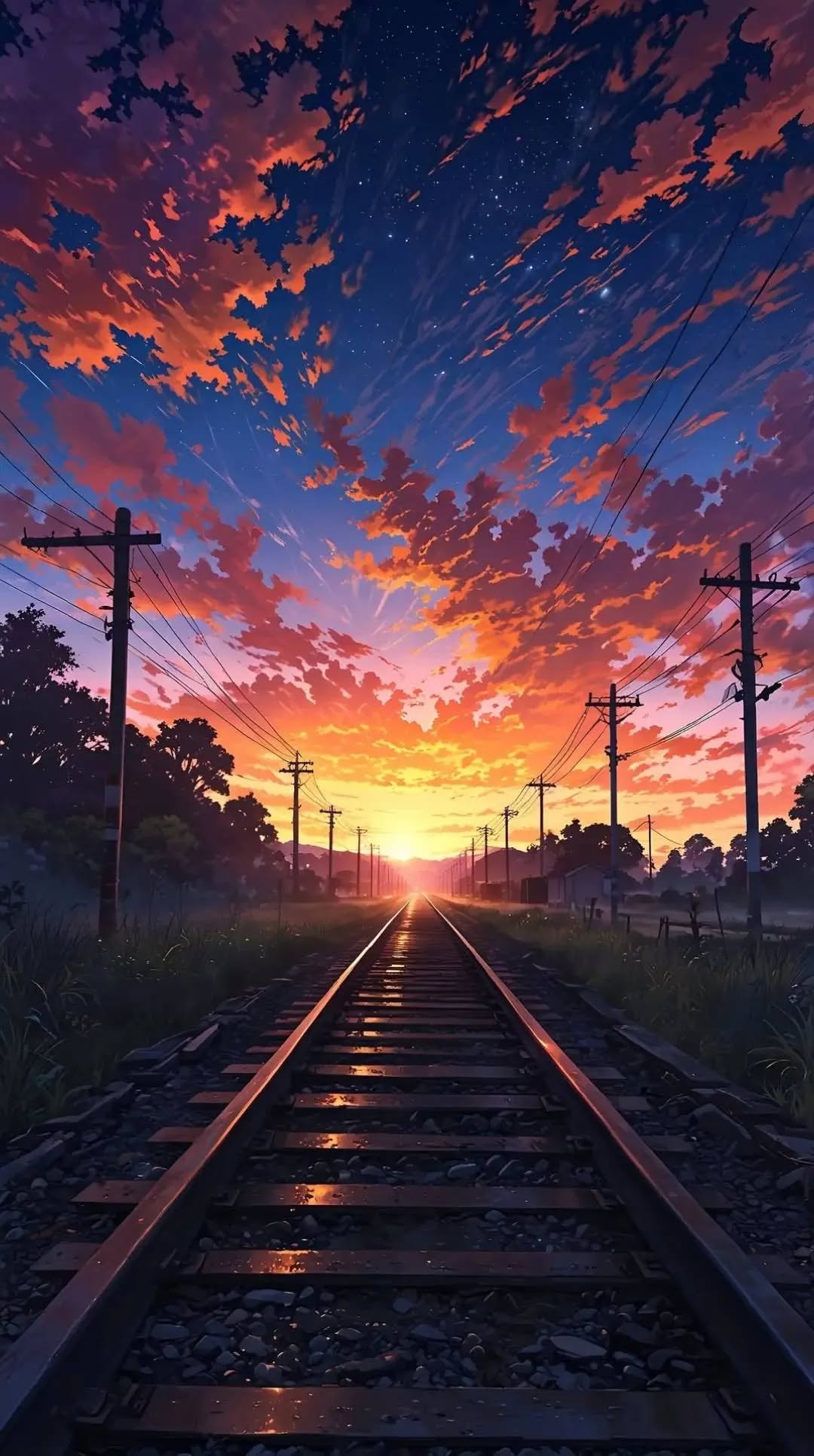 #lofi aesthetic#journey#japanese countryside#anime sunset#golden hour#calm wallpaper#end of summer#railroad tracks#aesthetic anime#evening sky#anime background#train tracks background#makoto shinkai style#twilight sky#one-point perspective#starry night#serene landscape#nostalgic scenery#phone wallpaper#vibrant clouds