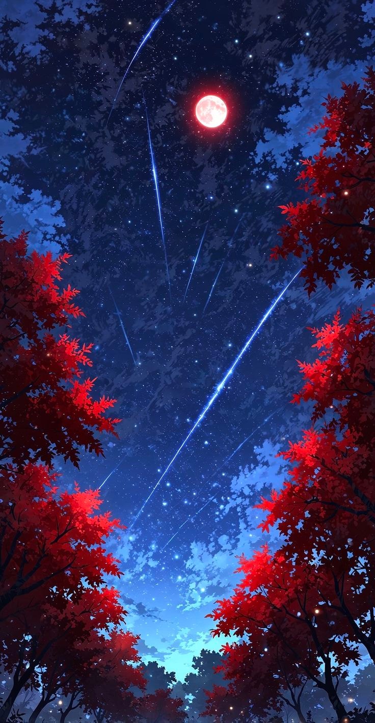 #shooting stars#enchanted forest#meteor shower#night aesthetic#anime sky#wondrous#phone background#japanese forest#tranquil#celestial#gazing at stars#magical night#red moon#anime landscape#fantasy landscape#vibrant colors#blue and red aesthetic#serene wallpaper#red maple trees#starry night#night sky wallpaper#dreamlike